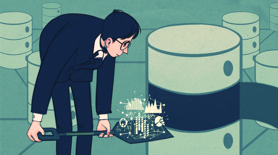 An illustration for McGill University’s online publication called Delve. For an article titled 'Not all Data Entry Work is Created Equal' by Lisa Cohen AD: Rosalie Nardelli